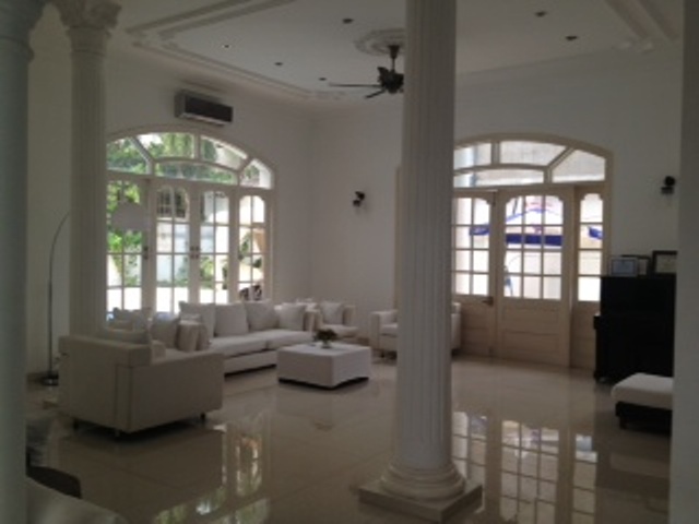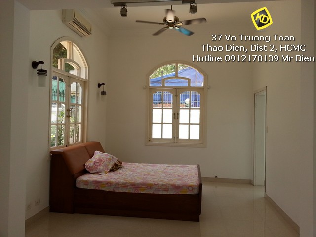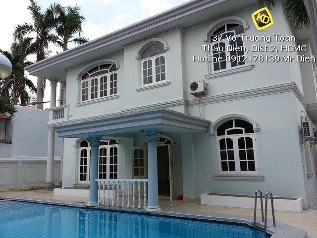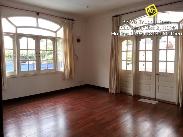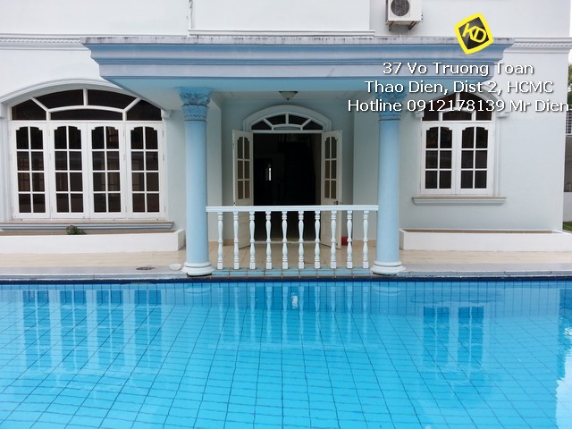 Bán biệt thự Lê Văn Miến Thảo Điền diện tích đất rộng 760m2 cực rộng rãi, xây dựng 1 trệt 1 lầu kiểu Pháp rộng rãi với 4 phòng ngủ thông thoáng có balcony rộng. biệt thự có phòng bảo vệ, khu nhà bếp + quản gia và khu phơi giặt riêng rẽ, hồ bơi sân vườn sạch đẹp.
