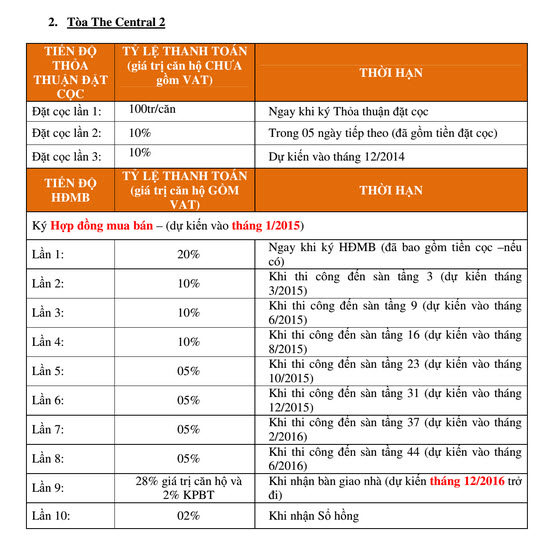LỊCH THANH TOÁN TÒA THE CENTRAL 2