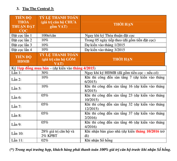 LỊCH THANH TOÁN TÒA THE CENTRAL 3