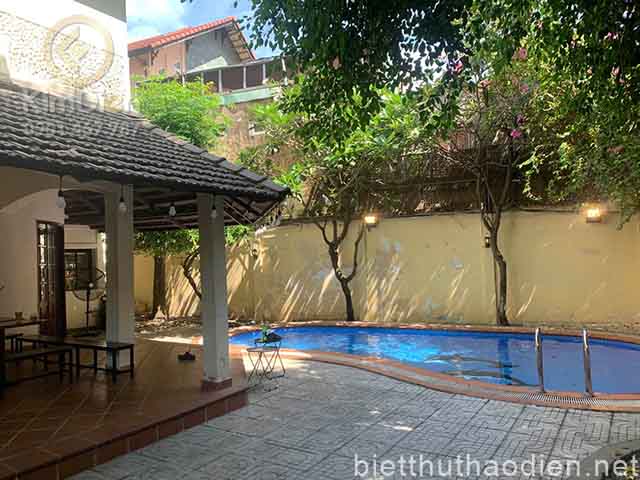 Biệt thự có diện tích đất 296m2, mặt tiền 11m, mặt tiền 26m. Thiết kế xây dựng 1 trệt, 2 lầu, áp mái, có hồ bơi, sân vườn