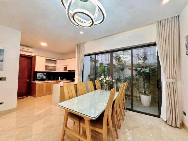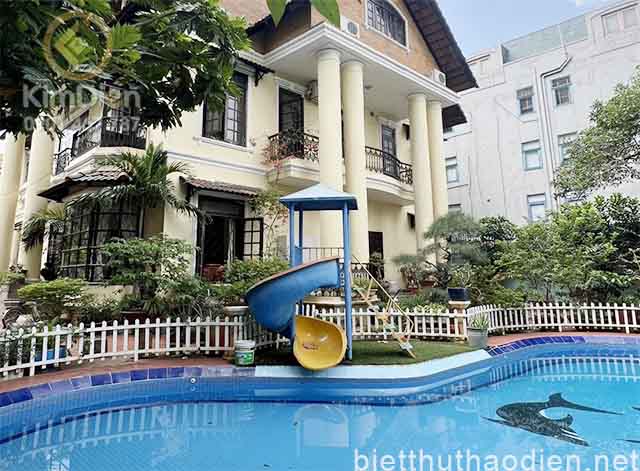 Biệt thự có thiết kế xây dựng gồm 1 trệt, 2 lầu, sân vườn, garage xe, có hồ bơi riêng. Phòng khách, phòng ăn, 4 phòng ngủ, biệt thự trang bị nội thất gỗ quý cao cấp