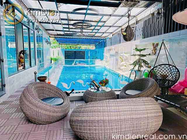 Biệt thự có thiết kế đẹp xây dựng hiện đại, gồm 3 tầng, sân thượng, ban côn cong rộng. Có hồ bơi sân vườn. Phòng khách, phòng ăn - bếp, 4 phòng ngủ, phòng làm việc. Biệt thự trang bị full nội thất cao cấp sang trọng