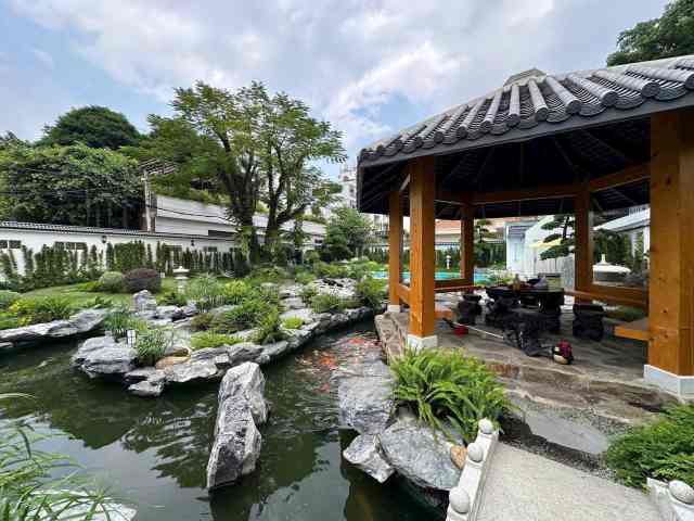 Có hồ bơi rộng, sần vườn trồng nhiều cây xanh tiểu cảnh rất đẹp, có khu BBQ.