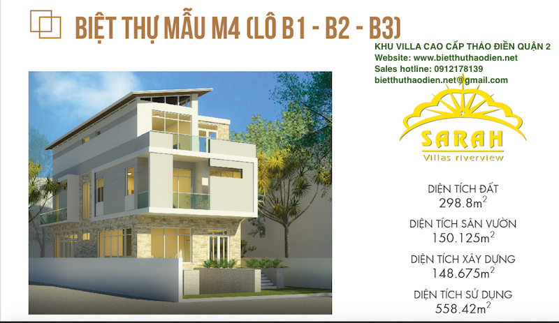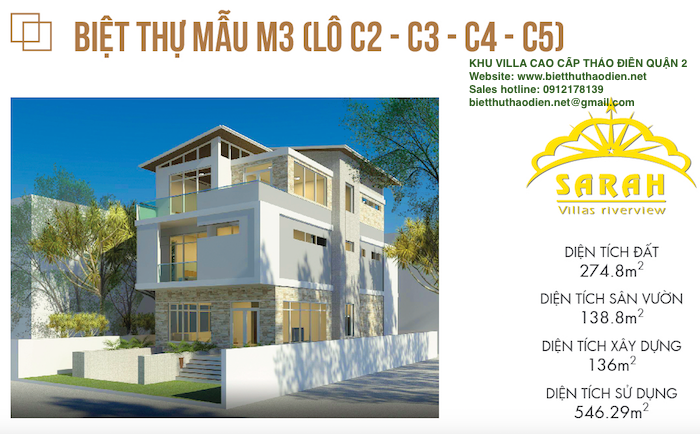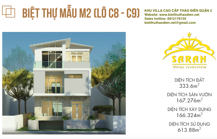 Khu biệt thự Thảo Điền Quận 2 có khuôn viên 9124,8m2, gồm 10 biệt thự mặt trong và 7 Biệt Thự Mặt tiền đường Nguyễn Văn Hưởng rộng từ 12-14m trở lên, và khu trung tâm thương mại Sarah Thảo Điền, 1000m2 công viên cây xanh, đường giao thông nội bộ rộng 10 - 16m.