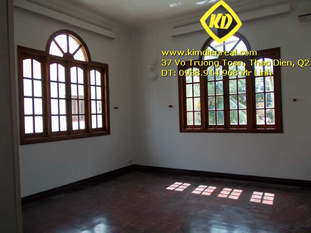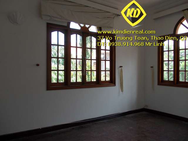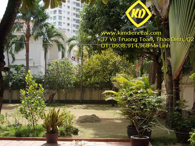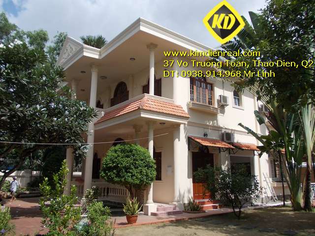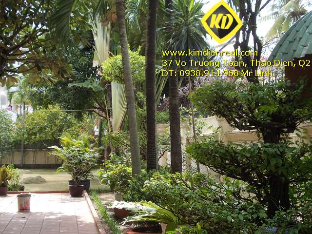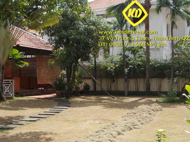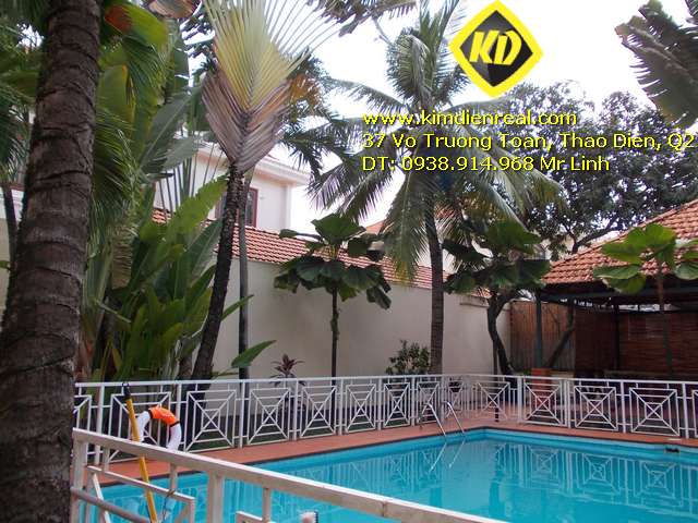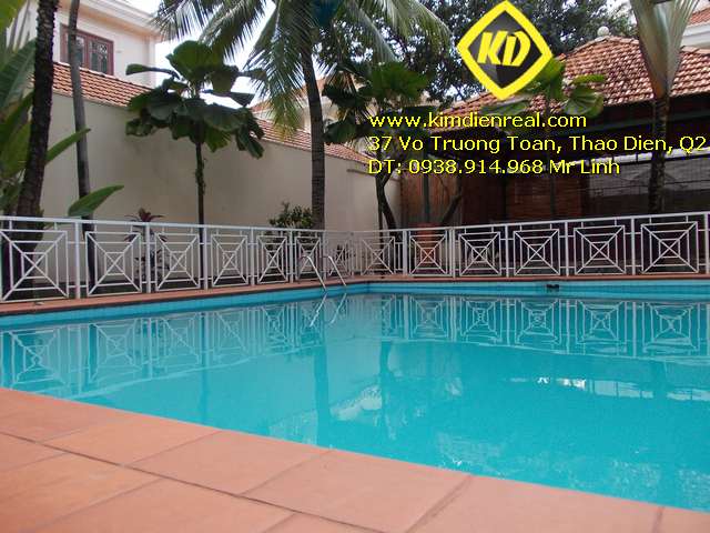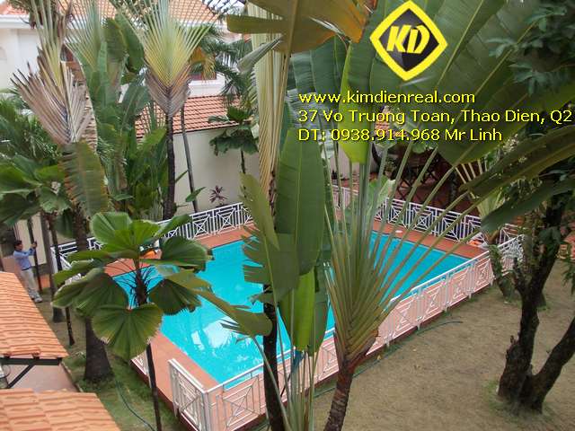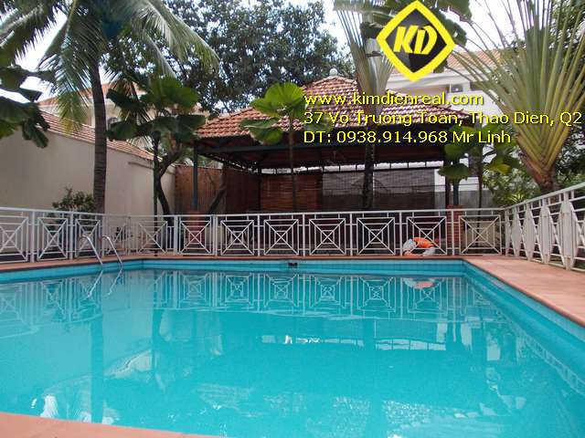 Cho thuê biêt thự hồ bơi sân vườn góc 2 mặt tiền Thảo Điền, xây dựng trên diện tích 1200m2, kiến trúc cổ điển áp mái, diện tích biệt thự khoảng 400m2, cấu trúc 1 trệt 1lầu, gồm 5 phòng ngủ rộng rãi, phần còn lại là khu hồ bơi và khu sân vườn cây cảnh bao bọc xung quanh ngôi biệt thự.