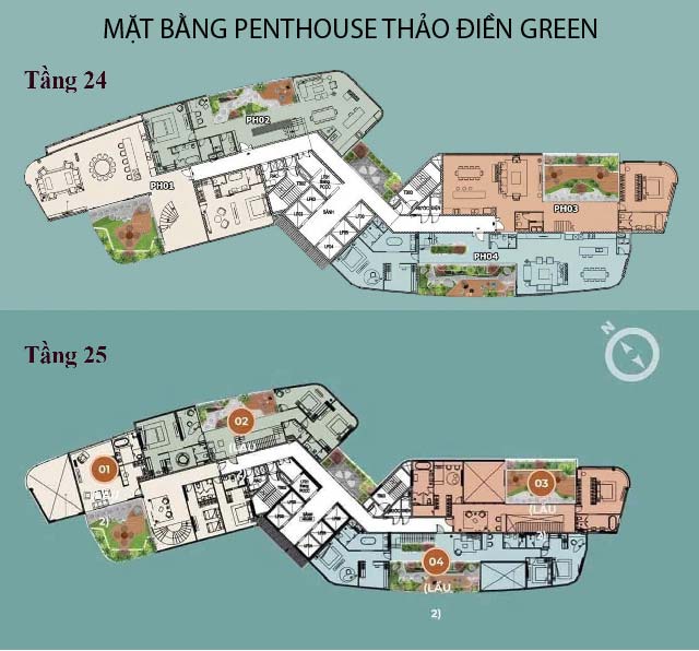 - Penthouse 1: Tổng diện tích 400.54m2 (tầng 24: 215.13m2, tầng 25: 185.41m2)